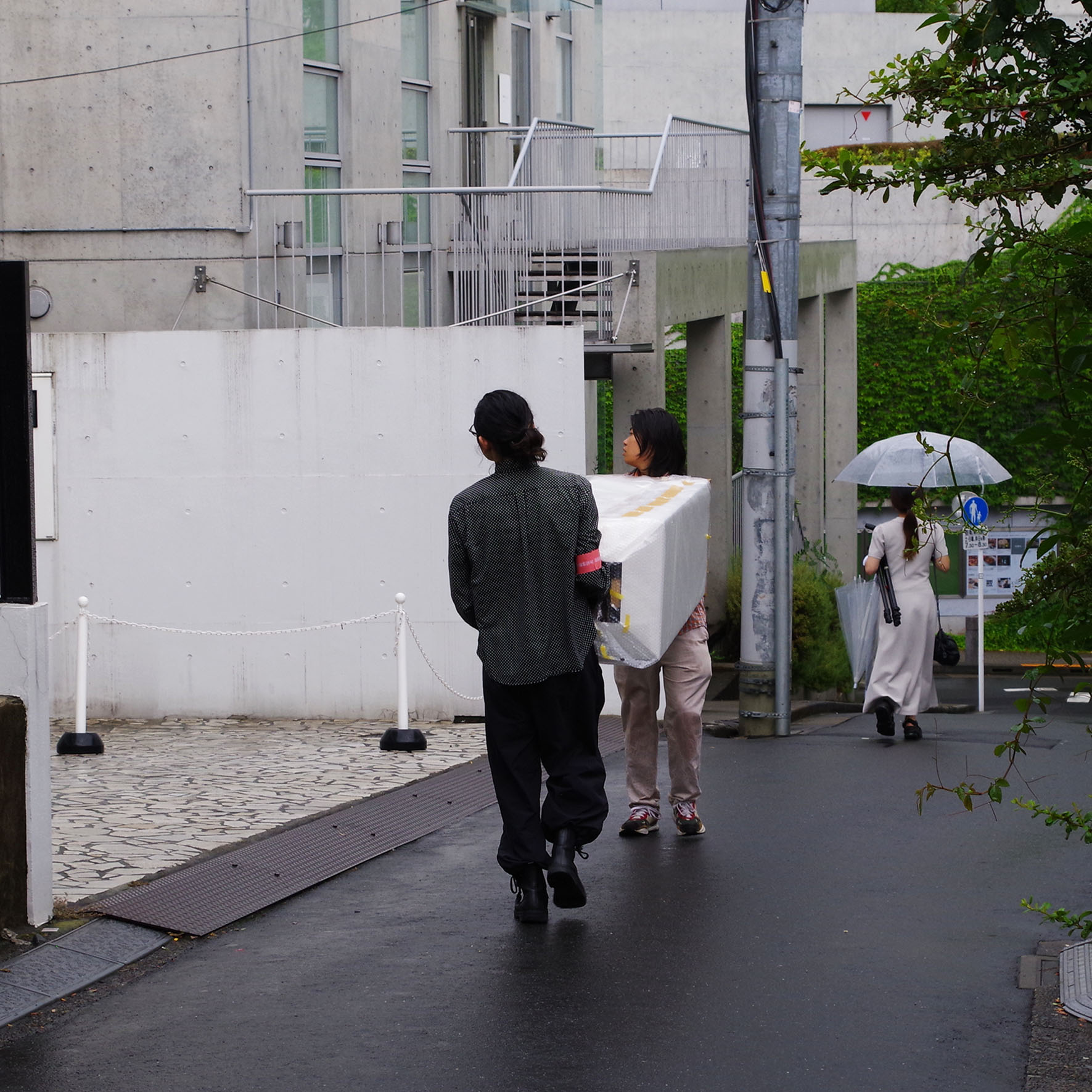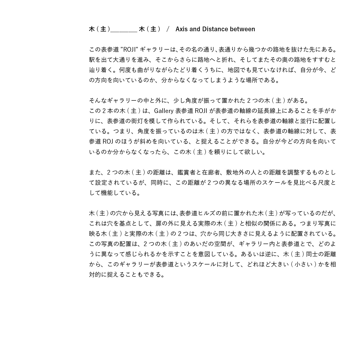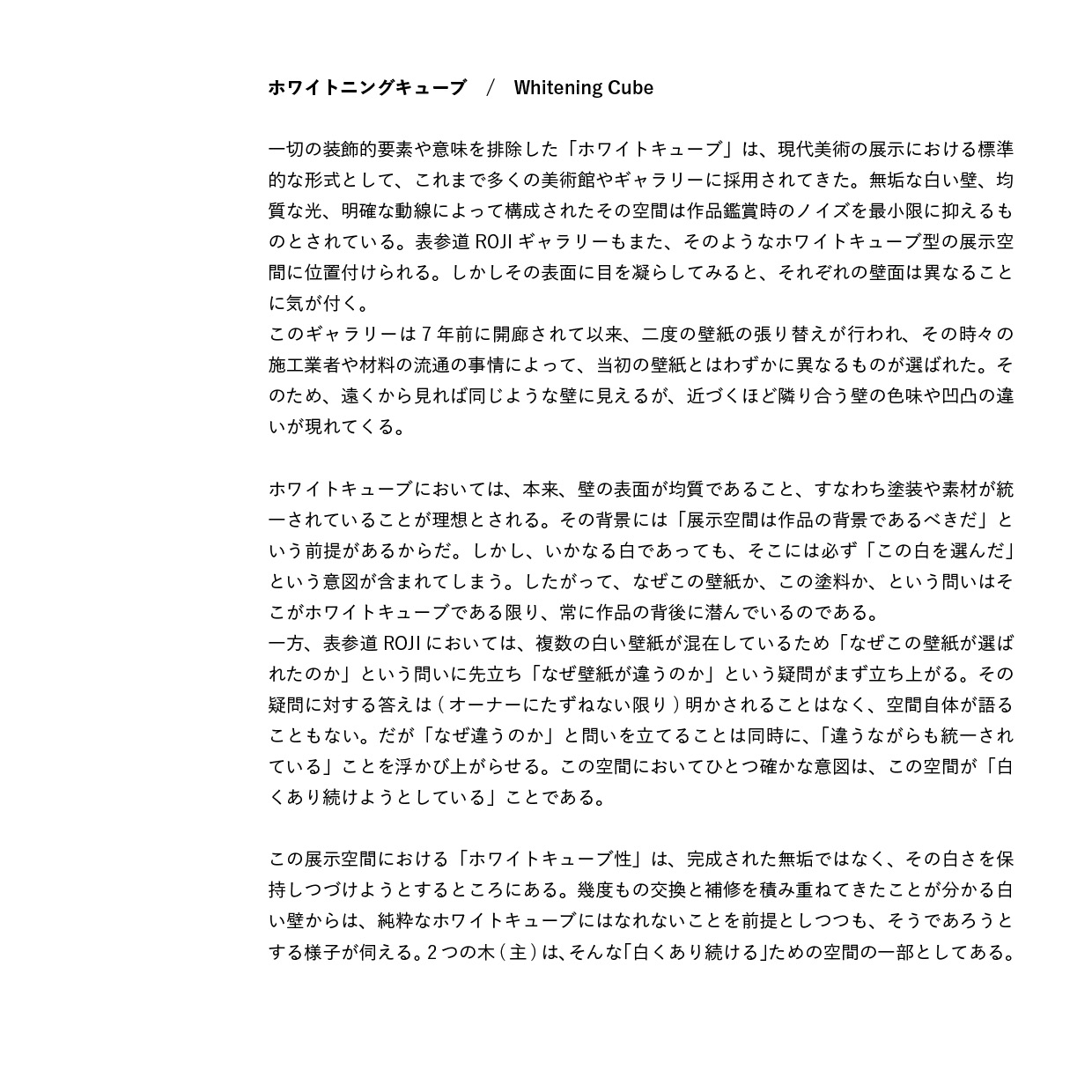 2 つの木(主)はそうした、ギャラリーを訪れる鑑賞者と在廊者、外を通り過ぎる人々との距離を調整するものとしてあります。