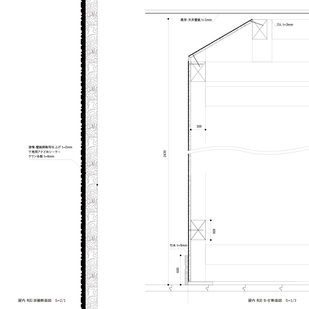 そこで、壁紙に見えそうで見えない仕上げにしようと壁紙の凸凹を模して湿式の材料で作ることにしました。そのため、奥の柱の仕上げは壁紙の偽物です。